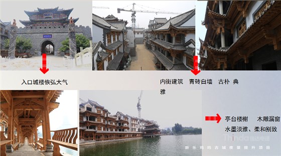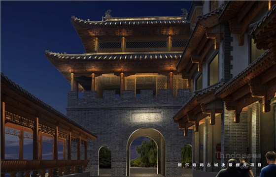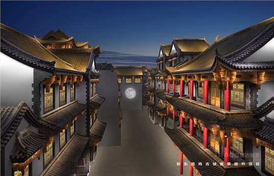 新樂市雞鳴古城黑瓦白墻、青磚門罩、木雕漏窗與建筑物融為一體,展現徽派建筑的端莊文雅、溫馨別致的藝術風格,展現人行視點的直觀感受。具備古典情調的雅致,給人們帶來的是休閑逸致與感官享受。根據古建筑燈光整體考慮,強化建筑帶給人們的夜間美,打造具有人文自然、觀賞體驗、休閑雅致、情感交流的夜間情境式體驗氛圍。
