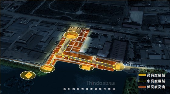 亮化設計從宏觀和微觀兩種尺度入手:在宏觀上強調整體性,建立清晰的夜景結構并區分主次,體現青磚黛瓦,淡雅風華,那種褪盡喧囂之后的寧靜和內斂。在微觀上,以人為本實現照明的舒適性,營造溫馨雅致的光環境。本案中雞鳴古城亮化設計將主入口處城樓及親水樓臺為高亮度區域,沿街立面烘托商旅氛圍為中亮度,建筑頂部營造靈境、淡雅的光環境,弱化表現為低亮度區域。主體光色以暖光呈現,靜態光為主。燈光主要體現其渾厚、大氣的建筑結構,打造整體感與形態美,滿足建筑自身功能和精神需求的同時,突出顯著入口標志。以間隔小投光形式呈現,突出入口醒目標志和節點設計。拒絕大面積重彩潑墨,以投光進行小范圍營造,點綴成景,留白處理,避免喧鬧、浮華,營造靜謐、文雅的氛圍。燈光錯落有致,層次分明,有熱鬧活力的商旅氛圍,也有溫馨雅致的古典情懷,使人漫步其中,移步異景,感受她的舒適與雅致。