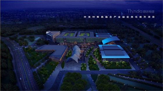 中關村軍民融合產業園區的亮化設計主要以建筑燈光為主體設計方向,用燈光的形式突出建筑結構特點,突出時尚、創新、科技、新潮的融合產業園。園區建筑結構整體簡潔、大氣,信達電通利用光影效果及景觀元素,打造東西、南北軸向的建筑縱身層次,整體以各種幾何形體組合而成,燈光在設計的同時尊重建筑本身的理念,優化夜景氛圍,通過塊與面的結合,塑造一個大氣魄、大追求的文化產業新品牌。