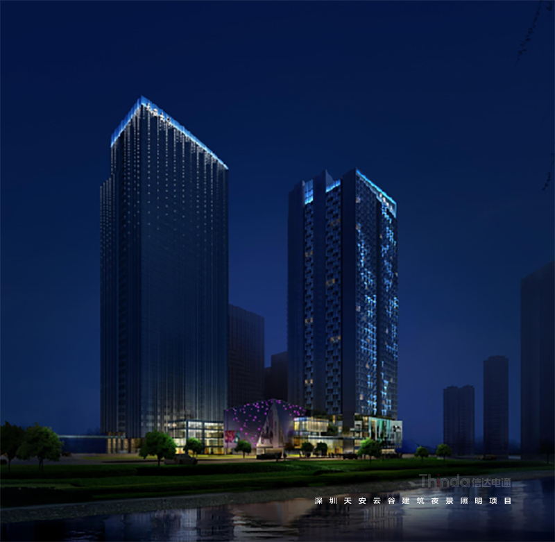 深圳天安云谷夜景照明建筑本身由建筑主體元素延伸至頂部,突出建筑高度和在夜間的遠觀效果,材質為玻璃幕墻。辦公樓建筑立面材質為玻璃為主,立面結構縱向延展性好。