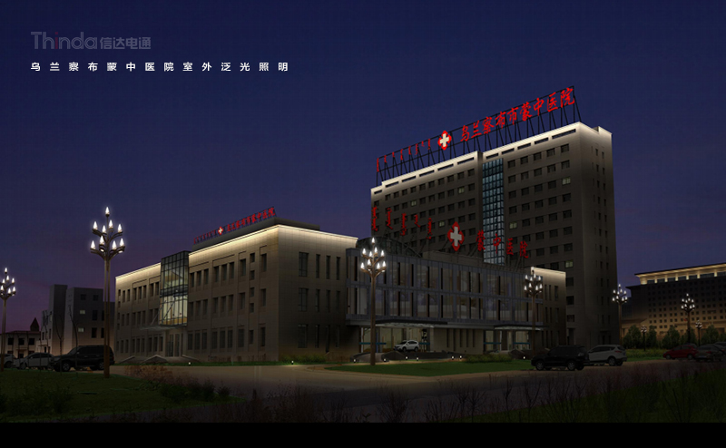 烏蘭察布蒙中醫院夜景照明改造項目中,信達在燈具選型上采用了大量高效節能的LED產品。LED壽命長,節能,充分體現了“綠色照明”的設計理念。從而也展現出了公共照明的照明方式。